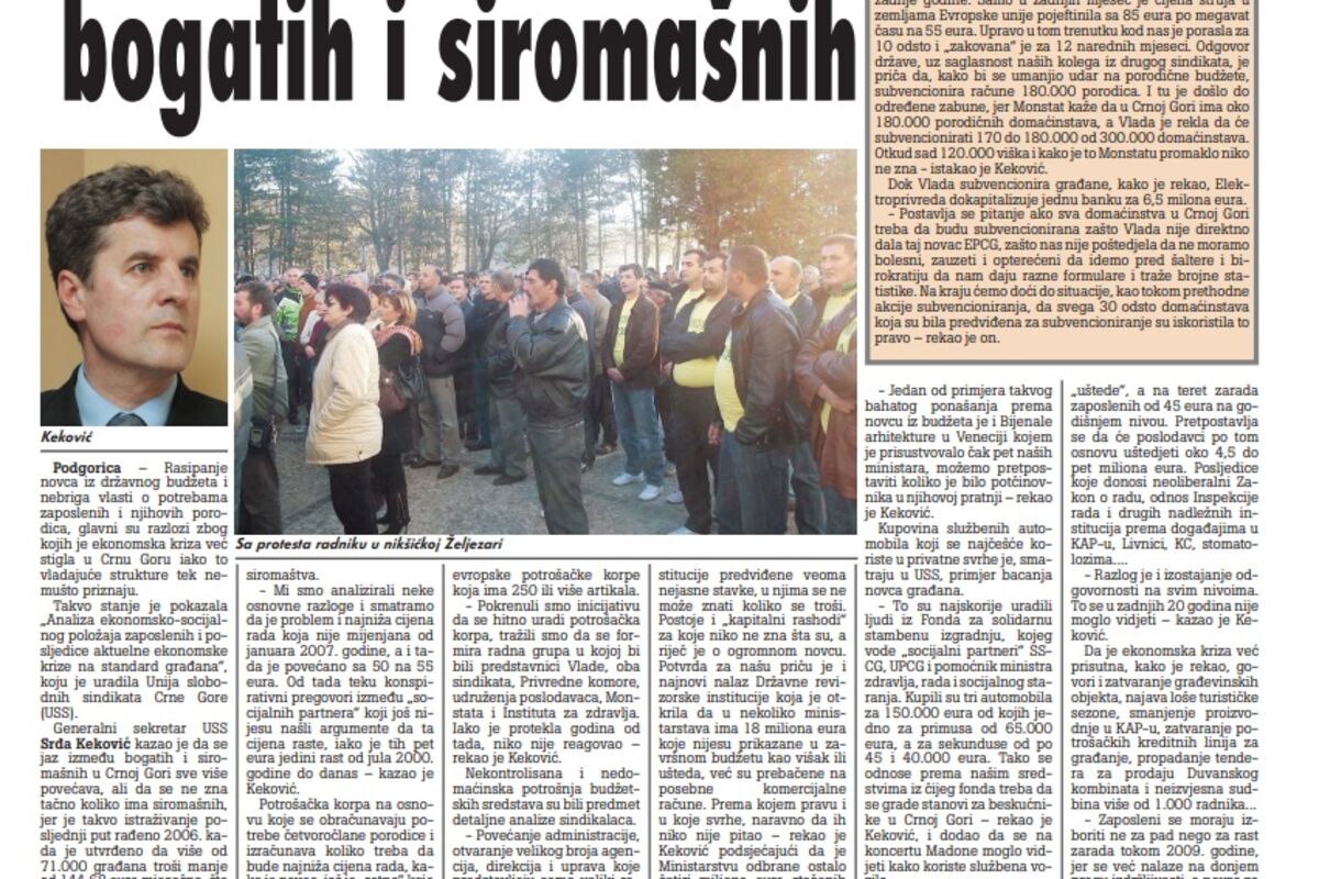 Generalni sekretar USS Srđa Keković kazao je da se jaz između bogatih i siromašnih u Crnoj Gori sve više povećava, ali da se ne zna tačno koliko ima siromašnih, jer je takvo istraživanje posljednji put rađeno 2006. kada je utvrđeno da više od 71.000 građana troši manje od 144,68 eura mjesečno, što je donji prag apsolutne linije siromaštva.