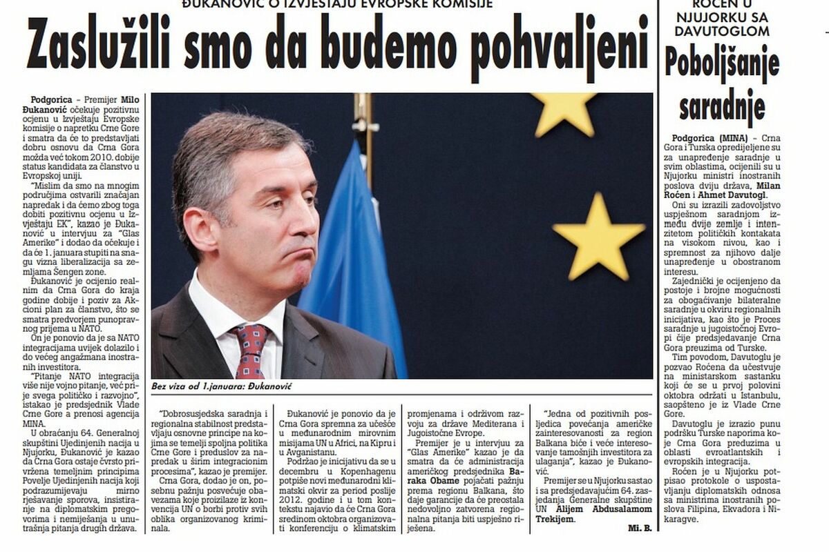 Premijer Milo Đukanović očekuje pozitivnu ocjenu u Izvještaju Evropske komisije o napretku Crne Gore i smatra da će to predstavljati dobru osnovu da Crna Gora možda već tokom 2010. dobije status kandidata za članstvo u Evropskoj uniji.