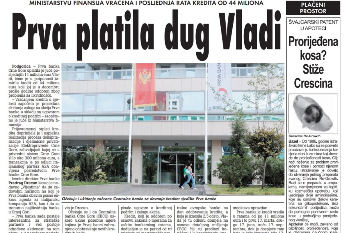 Prijevremenoj otplati kredita doprinijela je i uspješna realizacija procesa dokapitalizacije i djelimične privatizacije Elektroprivrede Crne Gore, zahvaljujući kojoj se u privredni sistem Crne Gore slilo oko 300 miliona eura, a transakcija je po odluci italijanskog partera A2A obavljena posredstvom Prve banke Crne Gore.