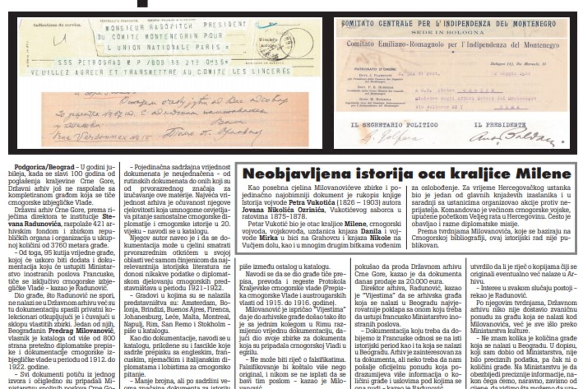 Dio građe, što Radunović ne spori, ne nalazi se u Državnom arhivu već su tu dokumentaciju spasili privatni kolekcionari otkupljujući je i čuvajući u sklopu vlastitih zbirki. Jedan od njih, Beograđanin Predrag Milovanović, vlasnik je kataloga od više od 800 strana pretežno diplomatske prepiske i dokumentacije crnogorske izbjegličke vlade u periodu od 1912. do 1922. godine.