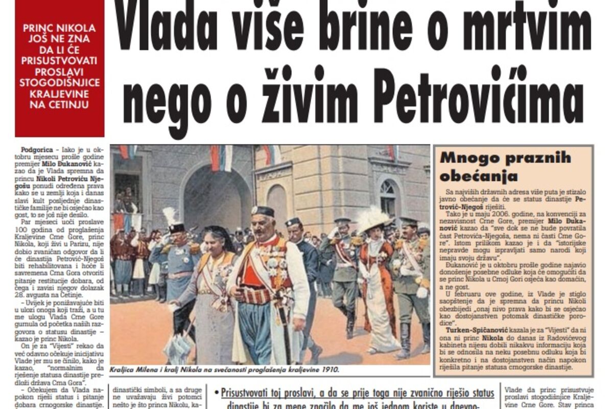 Par mjeseci uoči proslave 100 godina od proglašenja Kraljevine Crne Gore, princ Nikola, koji živi u Parizu, nije dobio zvaničan odgovor da li će dinastija Petrović-Njegoš biti rehabilitovana i hoće li savremena Crna Gora otvoriti pitanje restitucije dobara, od čega i zavisi njegov dolazak 28. avgusta na Cetinje.