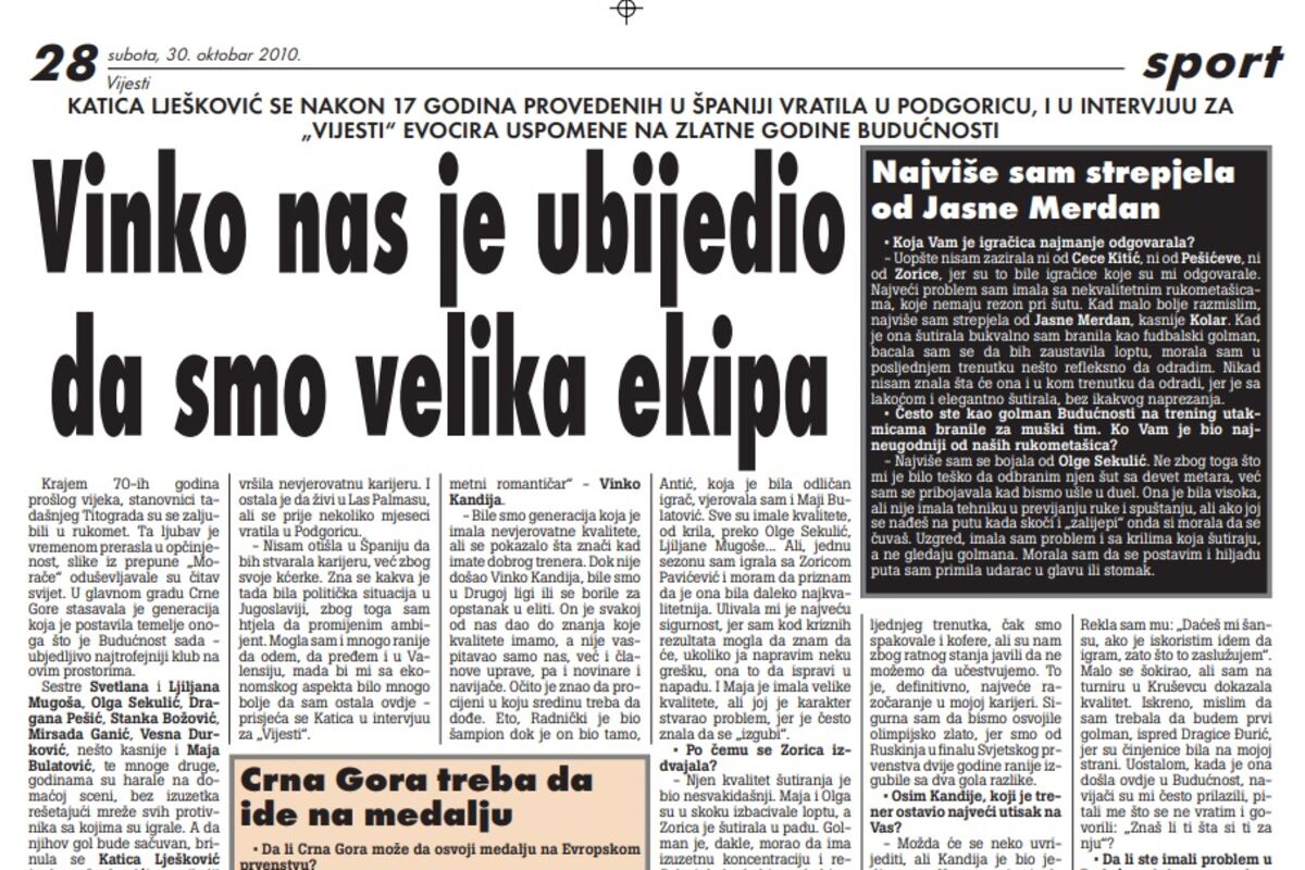 - Velika je stvar kad u nekoga možete da imate povjerenje kada ste na golu. Izuzetno sam cijenila Svetlanu Antić, koja je bila odličan igrač, vjerovala sam i Maji Bulatović. Sve su imale kvalitete, od krila, preko Olge Sekulić, Ljiljane Mugoše... Ali, jednu sezonu sam igrala sa Zoricom Pavićević i moram da priznam da je ona bila daleko najkvalitetnija. Ulivala mi je najveću sigurnost, jer sam kod kriznih rezultata mogla da znam da će, ukoliko ja napravim neku grešku, ona to da ispravi u napadu. I Maja je imala velike kvalitete, ali joj je karakter stvarao problem, jer je često znala da se „izgubi“.