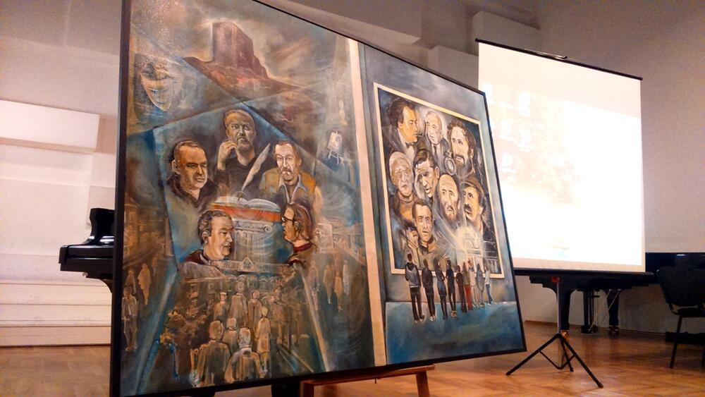 Na slici su, sa jedne strane prikazani portreti živih kulturnih stvaralaca iz Nikšića - novinara i publiciste Maksima Vujačića, pisca, reditelja i scenariste, Obrada Nenezića, glumca i voditelja, Mira Nikolića, koreografa i nekadašnjeg umjetničkog rukovodioca “Zahumlja”, Radislava Đuričića, i autora, Jovana Karadžiča, dok se na drugoj strani nalaze portreti onih koji nijesu među živima - arhitekte Slobodana Vukajlovića, privrednika Stanislava Ćana Koprivice, pjesnika i aforističara Milana Duga Krivokapića, pjesnika i boema Vitomira Vita Nikolića, slikara Dušana Jeknića, reditelja i scenariste Živka Nikolića i glumaca Veljka Mandića i Draga Malovića. Pri dnu drugog dijela slike je zgrada starog Nikšićkog pozorišta koje je srušeno 2008. godine.