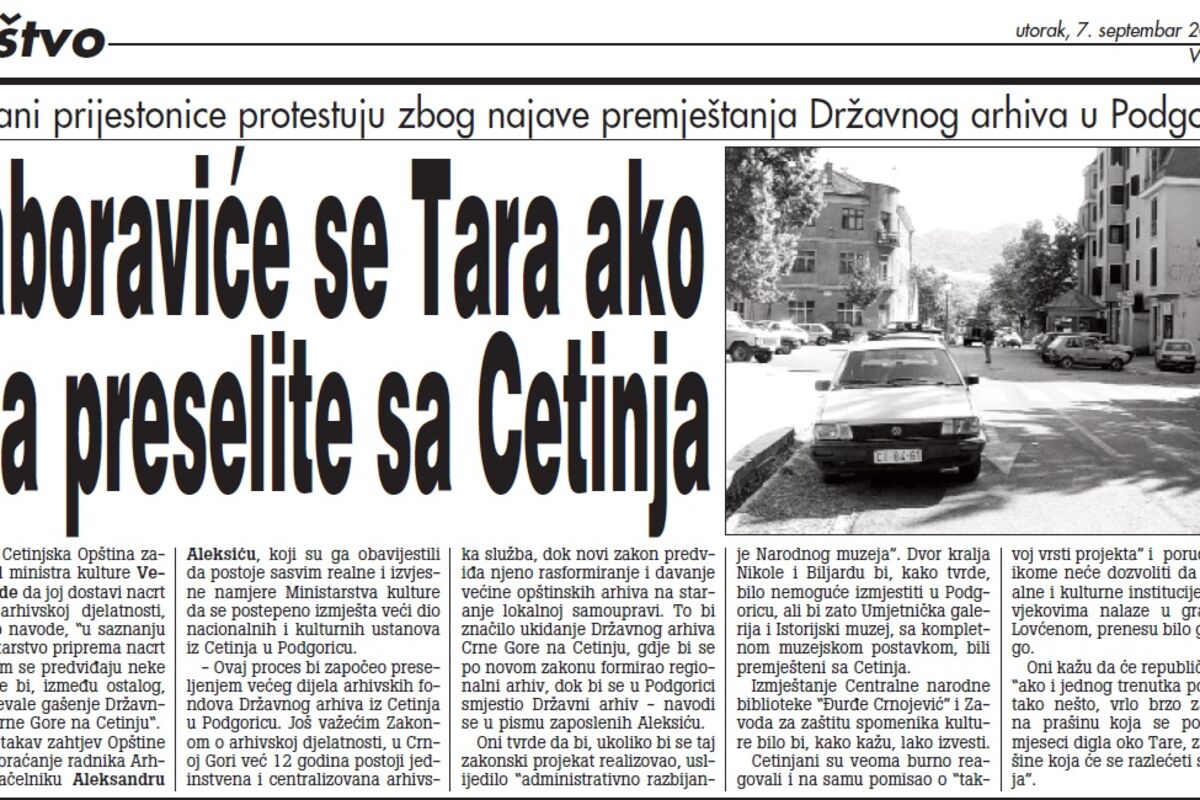 - Ovaj proces bi započeo preseljenjem većeg dijela arhivskih fondova Državnog arhiva iz Cetinjau Podgoricu. Još važećim Zakonom o arhivskoj djelatnosti, u Crnoj Gori već 12 godina postoji jedinstvena i centralizovana arhivska služba, dok novi zakon predviđa njeno rasformiranje i davanje većine opštinskih arhiva na staranje lokalnoj samoupravi. To bi značilo ukidanje Državnog arhiva Crne Gore na Cetinju, gdje bi se po novom zakonu formirao regionalni arhiv, dok bi se u Podgorici smjestio Državni arhiv – navodi se u pismu zaposlenih Aleksiću.