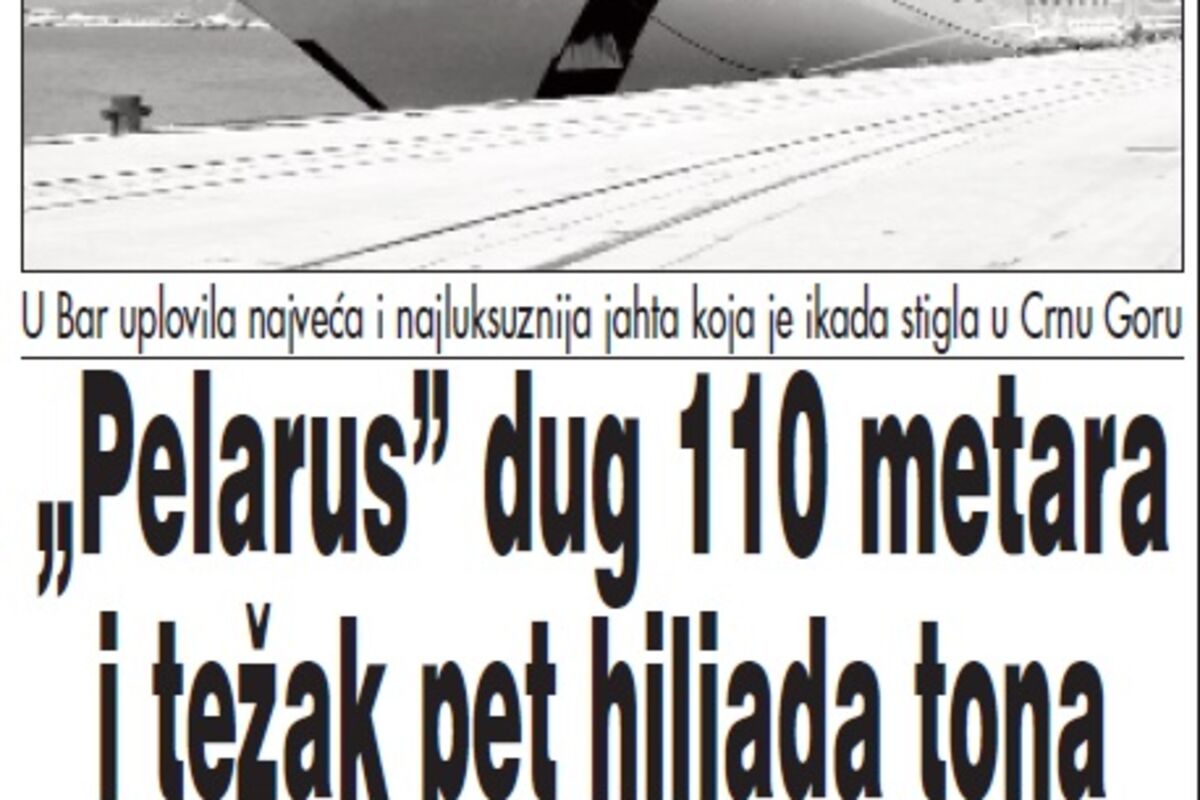 Na petrolejski terminal Luke Bar juče je oko sedam sati ujutro vezana jahta “Pelarus”, koju su poznavaoci nautičkih prilika ocijenili najvećom, a po svemu sudeći i ubjedljivo najluksuznijom jahtom koja je ikada uplovila u crnogorske vode.
