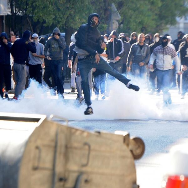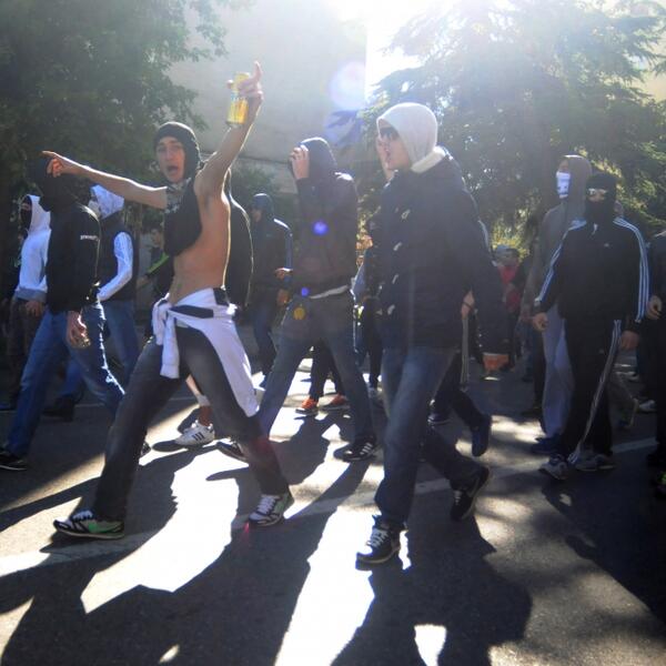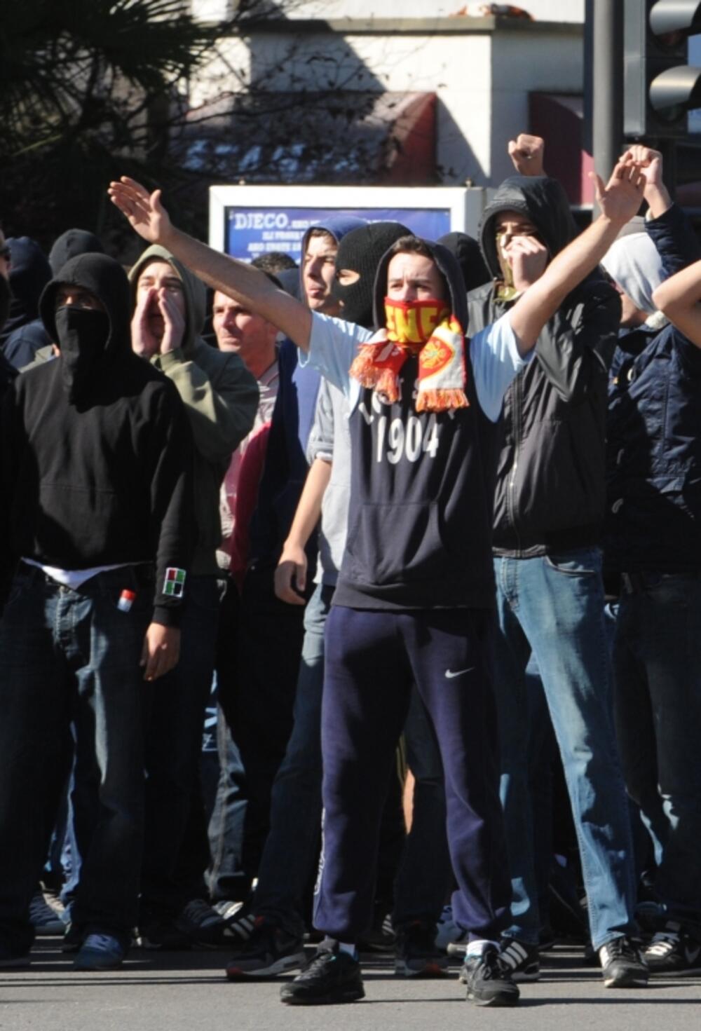 11. 30 časova - Policija palicama rastjeruje grupe vandala kod Ekonomske i Trgovinske škole. Zbog suzavca huligani bježe ka Zabjelu.