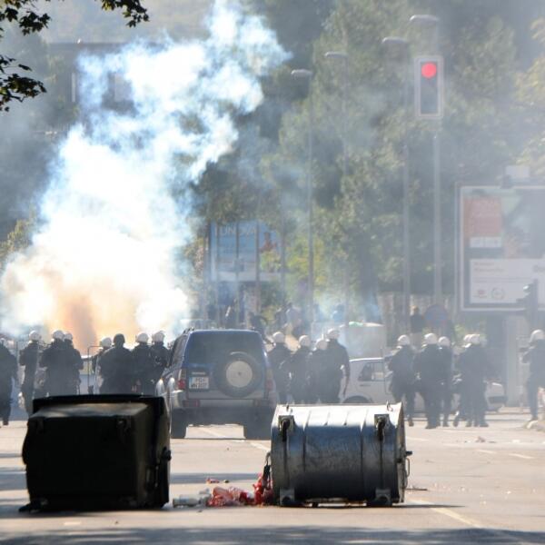 11.11 časova - Iz pravca centra grada čule su se jake detonacije, jer je policija počela da u pravcu huligana ispaljuje suzavce.