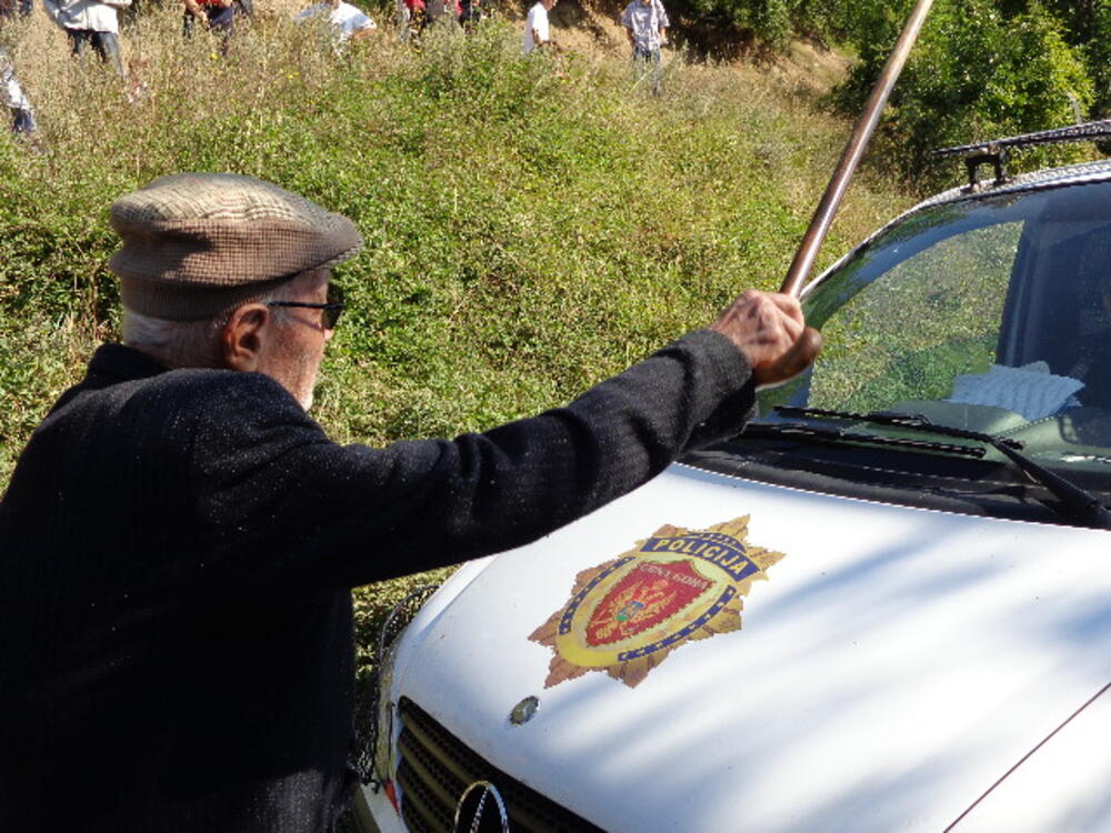 Kada je jedno policijsko vozilo pokušalo da prođe ka Vasovim vodama, ispred njega je legao Tomović, nakon čega su okupljeni počeli da uzvikuju "hapsite lopove", "Vuka lopove".