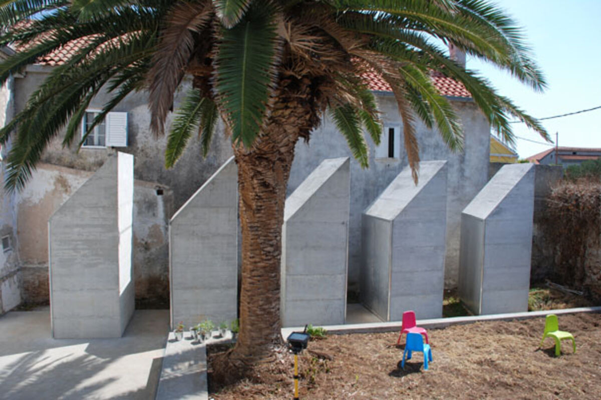 Tandem je problem riješio izgradnjom 5 kućica dimenzija 1X1,5 m u osnovi - odnosno multipliciranjem identičnih betonskih volumena u pravilnom ritmu - što je u neku ruku povođenje za jednim od gotovo arhetipskih principa gradnje u okviru tipologije kuća sa dvorištem, ne samo na teritoriji Hrvatske, već svuda u regionu ex-YU - a to je "princip koji servisnim i strogo utilitarnim sadržajima nemilice izgrađuje, dograđuje, prigrađuje dvorišni prostor".