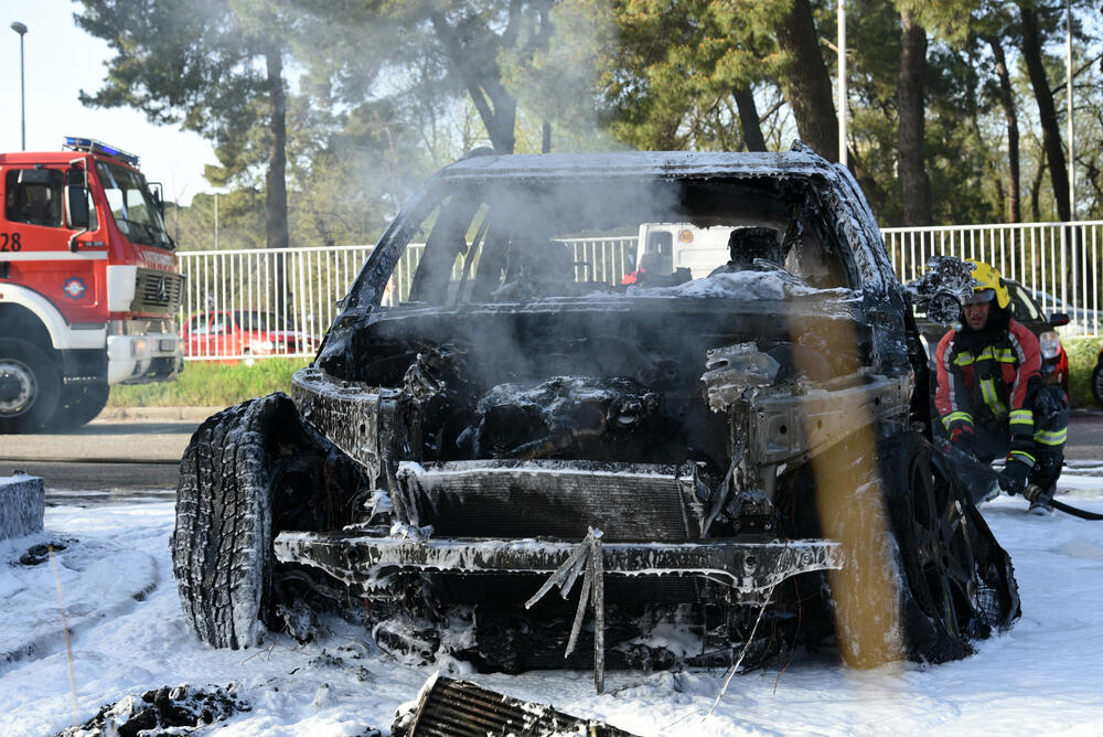 Automobil ljekara Predraga Jovovića, koji je zapaljen u noći između utorka i srijede ispred Kliničkog centra Crne Gore, ponovo je zahvatio plamen danas u popodnevnim satima.