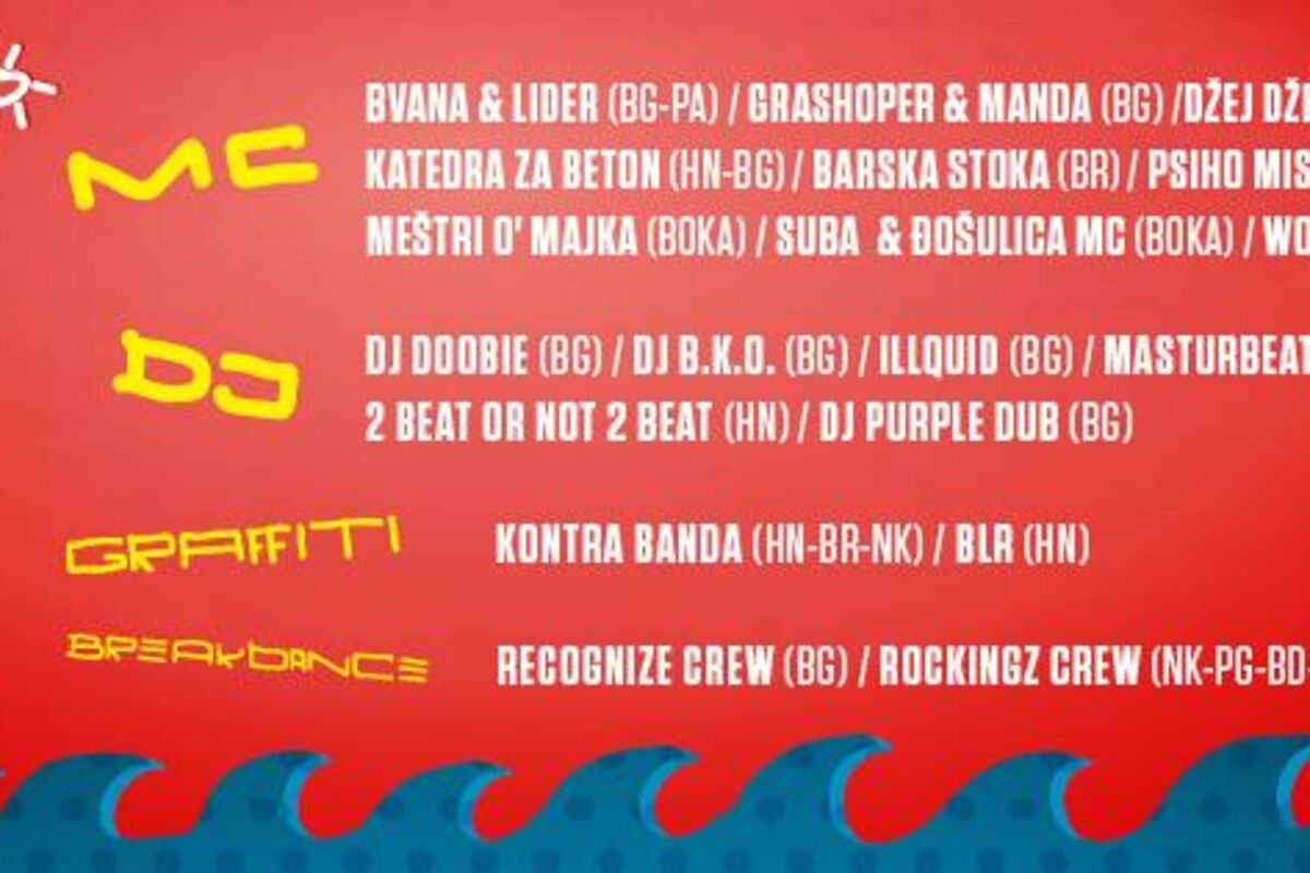 Publiku će svojim setovima zabavljati DJ-evi Doobie, BKO, Illquid, Masturbeator i duo 2 beat or not 2 beat, grafite će crtati Kontra Banda, La Krc i Blr, dok će plesačke sposobnosti pokazati Recognize Crew i RocKingZ Crew.