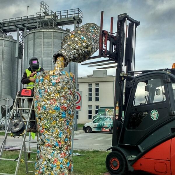 Skulptura visoka pet metara, napravljena je od limenki sakupljenih u krugu Trebjese u sklopu globane akcije - Svaka limenka se računa.