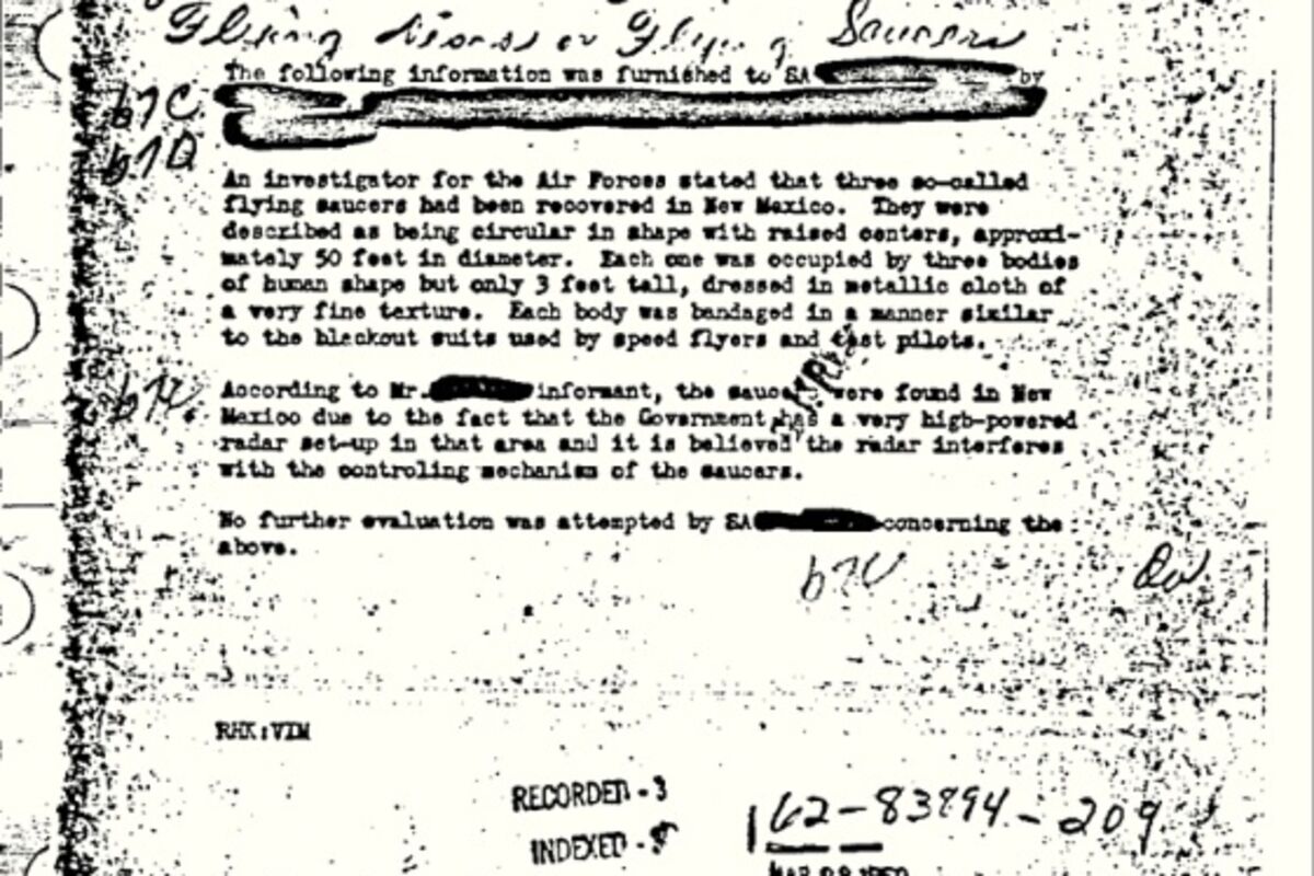 Najpopularniji dokument u FBI Vault sistemu je bilješka stara 63 godine, koja predstavlja nepotrvrđeni izvještaj o tri NLO-a koji su se navodno srušili u pustinju u Nju Meksiko.