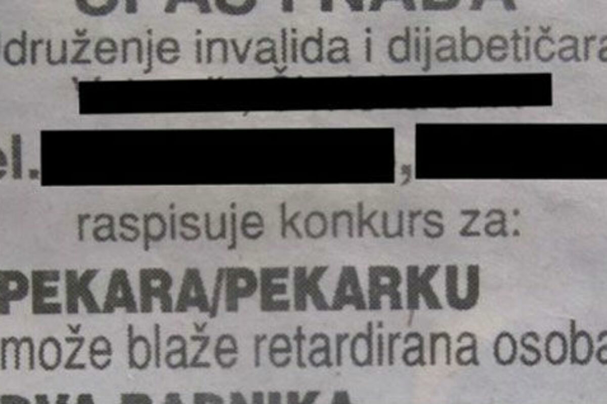 U jednom novosadskom oglasniku objavljen je oglas u kojem se traži "blaže retardirana osoba" za posao pekara.