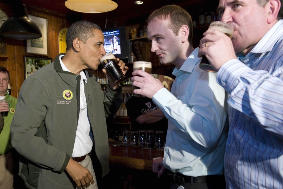 Obučen u zelenu jaknu, Obama je došao u pab gdje je popio čašu crnog Ginisa, a pored je bio njegov daleki rođak sa majčine strane.
