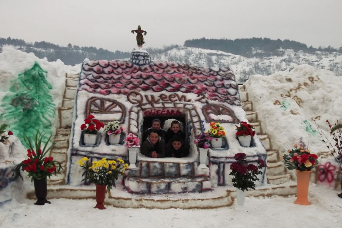 Radnici vulkanizerske radnje "Zorić" u subotu su od snijega napravili kultnu "bubu", a danas su mališani snijeg iskoristili tako što su napravili cvjećaru.
