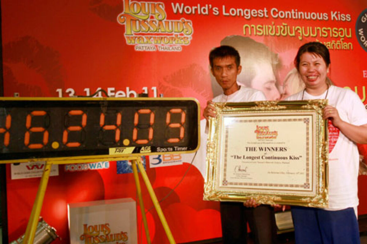 Pobjednici, 51-godišnji muškarac i 37-godišnja žena ostali su spojenih usana punih 46 sati, 24 minuta i devet sekundi i osvojili nagradu od 100.000 bata (2.400 eura) kao i dijamantski prsten vrijedan 50.000 bata.