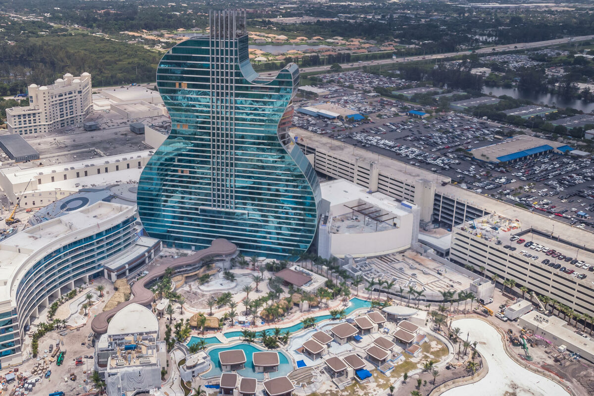 Dizajniran kao dvije gitare naslonjene jedna na drugu, visine oko 140 metara, pravi je spektakl za sve koji ga ugledaju. Ima 35 spratova, 638 luksuzno opremljenih apartmana i soba, bazene, lagunu kao i Rok spa od 3.900 kvadrata jer se ceo hotelski kompleks nalazi na milju od plaže u Holivudu, mjestašca nedaleko od Majamija i Fort Lauderdale.