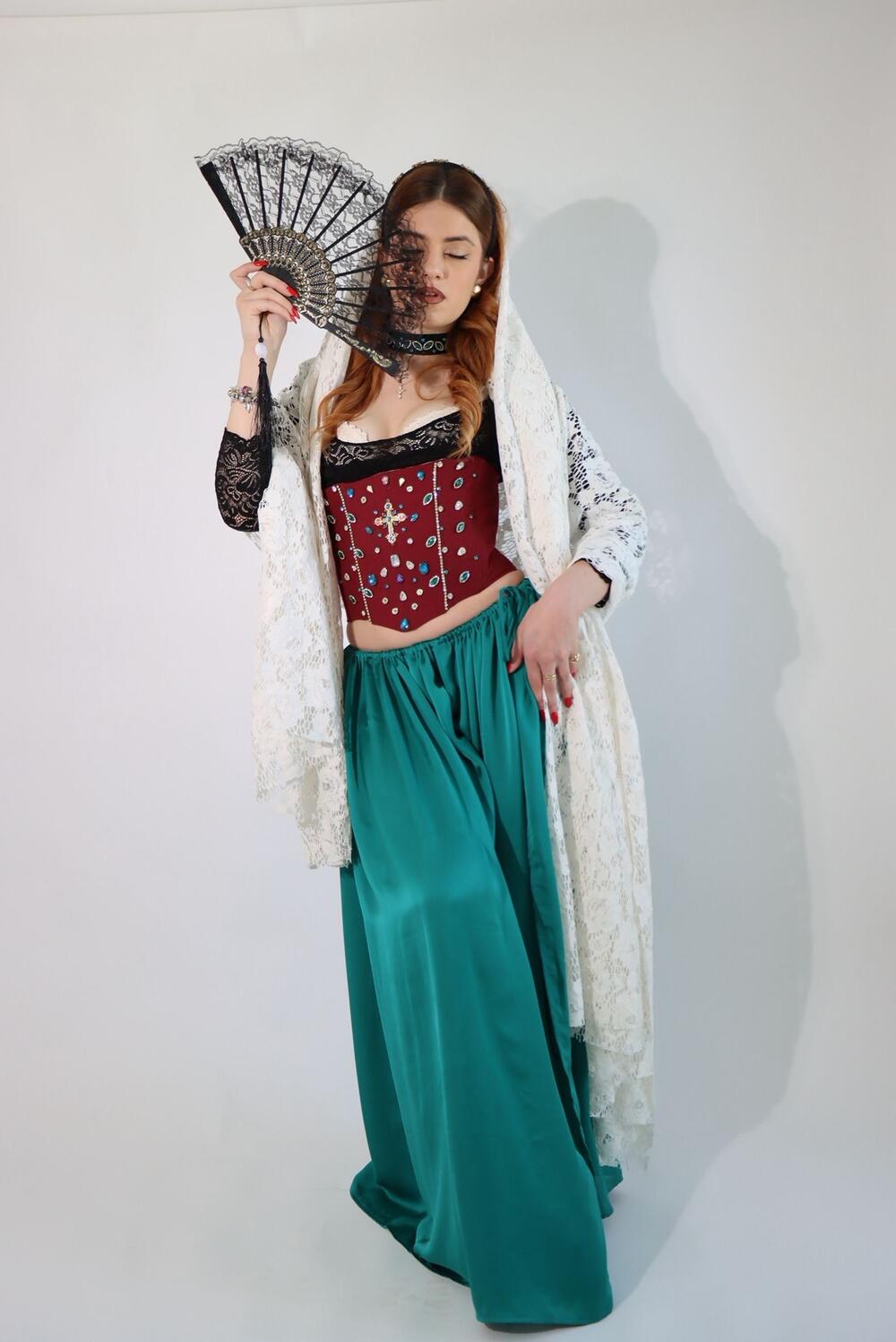 “Kada su u pitanju materijali, najviše sam koristila brokat, saten, svilene materijale i čipku. Komadi su dodatno ukrašavani vezom, različitim kamenjem i perlicama, čime je postignut i drugačiji vizuelni efekat. Pojedine tkanine sam naručivala posebno da budu izrađene prema motivima i zamislima koje su bile u skladu sa konceptom kolekcije”, govori ona.